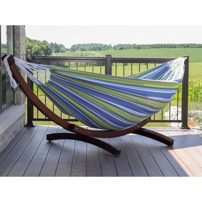 - Blue And Green Striped Hammock With A Dark Wood Hammock Stand Set