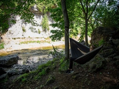 This black and gray hammock is the perfect hammock to bring with you on your travels! This hammock folds up in an attached sack and is perfect for bringing with you wherever you may go. Read a book, take a nap or have a drink while swaying in the warm breeze this summer with this hammock. Order your hammock today to relax in style this summer!Features:Black and gray nylon hammockThis hammock can hold up to two peopleComes with a sack that you can store the hammock inWeight capacity: 400lbs For outdoor use onlyDimensions: 128 inches long by 79 inches wideMaterial(s): nylonNote: Stand and hanging hardware are not included