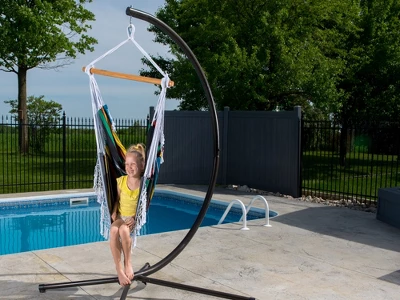 This hammock chair is the perfect way to relax in style in your own backyard. Read a book, take a nap, or have a drink while swaying in the warm breeze this summer with this hammock. This hammock chair is perfect for hanging from your ceiling, on your patio, or on a hammock chair stand. Order your hammock chair today to relax in style this summer!Features:Multi-color Brazilian hammock chairCan hold 1 adult or 2 childrenWeight capacity: 250 lbsThis chair can be hung on its own from a ceiling, or used with a hanging chair standRecommended for indoor or outdoor useDimensions: 72”H X 24”W x 30”LMaterial(s): cottonNote: Hanging bar included. Hammock chair stands sold separately.