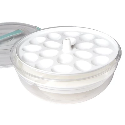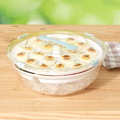 8-Compartment Veggie Serving Tray entertains with ease. This serving tray is not just perfect for presenting an array of delectable options, but it also features an ice tray at the bottom to keep fruits, vegetables, shrimp and dip fresh throughout your gathering. Individual compartments are easy to remove and refill one at a time. Includes compartment designed for deviled eggs. Made of: Polystyrene and polypropylene Measurements: 12″ dia. x 5-1/4″H Notes: Hand wash only
