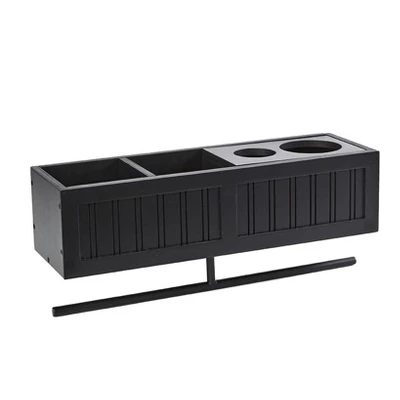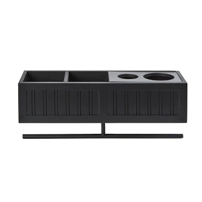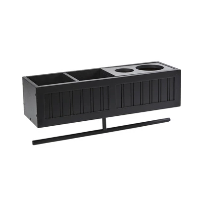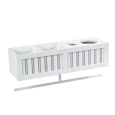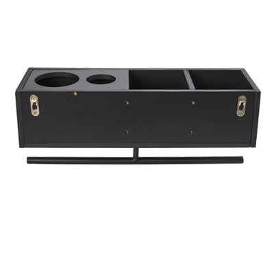 Add specialized storage to your bathroom with this Beauty Wall Shelf with Towel Bar. The floating shelf has built-in storage on top, two 4″ sq. compartments, as well as circular openings for holding your hair dryer, flat iron or a brush. A towel bar hangs beneath