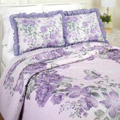 Give your bedroom the look of a garden with this flower pillow sham. Flowers in shades of purple are clustered tightly together on the white pillow sham. There are so many flowers that it almost looks like the pillow sham is purple. Sold as an each, these standard pillow shams are trimmed with a lavender ruffle all around. 26″W x 20″L. Polyester with polyfill. Machine care.