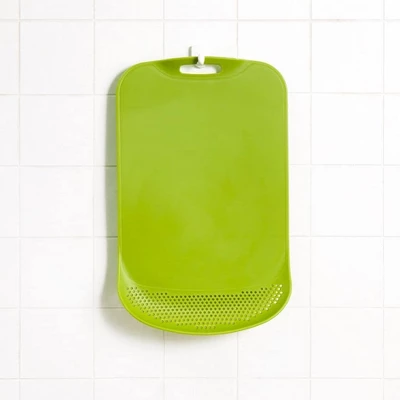 Chopping Board with Colander has an innovative design that allows the transfer of chopped items quickly without spilling. It’s ideal for cutting vegetables, fruits or meats. Non-absorbent and non-porous mat protects countertops and keeps knives from dulling. Features loop for easy hanging storage. Made of: Plastic Measurements: 8-1/2″L Notes: Hand wash only