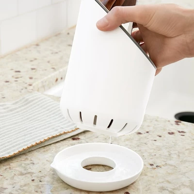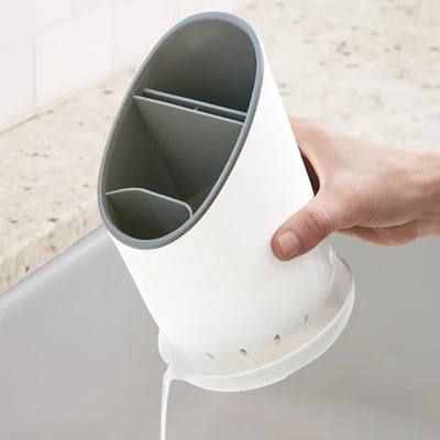 Cutlery Holder with Drip Tray has a clever design that helps your utensils dry while keeping your counter dry and clean. Simply place your cutlery in the top, and any dripping water flows into the bottom. The tray is removable so you can easily dump the water. Made of: Polystyrene and polypropylene Measurements: 4-1/3″ dia. x 7-1/3″H