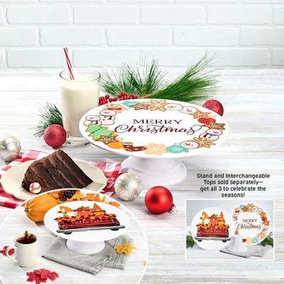 Holiday Interchangeable Cake Stand serves your specialties with festive flair! Combine a beautifully decorated Interchangeable Cake Top with the Cake Stand to create a fun presentation for cakes, cookies, cupcakes and more. When the season changes, simply switch out the top with a new design. No need to store multiple stands for different holidays! Cake Stand Melamine 5-1/2″ dia. x 4″H Hand wash only Interchangeable Cake Top Melamine 12″ dia. x 3/4″H Dishwasher safe