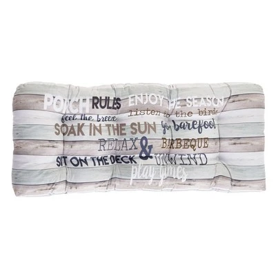 Extend your farmhouse décor to your outdoor area with this seat cushion in patio and porch options, which feature different colorways. The addition of this decorative seat cushion increases the comfort level of your patio furniture. The wood themed décor item features printed wood-look slats listing the rules in various fonts and colors. Generously filled, cushions like this one are like outdoor pillows to sit on. 42″W x 17″D x 3″H. Polyester with polyfill. Machine wash and line dry.