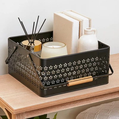 The Metal Storage Basket is a versatile organizing solution that can be used throughout your home. Whether you need to store lotions in the bathroom, spices in the kitchen, or craft supplies in the living room, this basket is both pretty and practical. It features sturdy, easy-carry handles, providing a comfortable grip and adding a touch of natural elegance to its design. Its compact size offers ample storage space while fitting neatly into small areas, making it a convenient addition to any room. A stylish look that complements various home decor styles, helping to keep your home tidy and organized.
