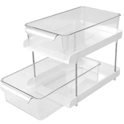 Compact 2-Tier Storage drawers with Handles organizes countertops, vanities, desktops and more. Versatile storage solution keeps everything hidden away but still easily accessible when you need it. Handles make it easy to pull out the shelves and find what you want. Made of: PET, polystyrene and metal Measurements: 12-1/2″W x 8-5/8″ x 10-5/8″H Notes: Some assembly required; assembly hardware included