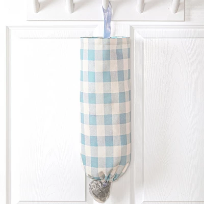 The Springtime Plastic Bag Dispenser is a cylindrical container adorned with a light blue and white checkered pattern, giving it a fresh and clean springtime look. It has an elasticized opening at the bottom, allowing easy access to the bags while keeping them securely in place. A solid light blue loop is attached at the top, making it convenient to hang on hooks or knobs in various locations. The dispenser appears to be made of fabric, suggesting it is washable and reusable, which contributes to its eco-friendliness. Its compact and simple design ensures it doesn’t take up much space, making it ideal for kitchens, pantries, or closets. Designed to store and dispense plastic bags, it helps keep the area organized and reduces clutter. By encouraging the reuse of plastic grocery bags, this dispenser supports eco-friendly practices and helps reduce waste.