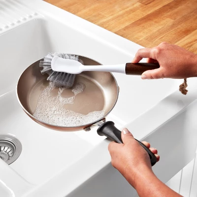 - Easily clean up any mess in the kitchen when you have the right tool, such as this dish brush with pot scraper.