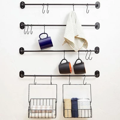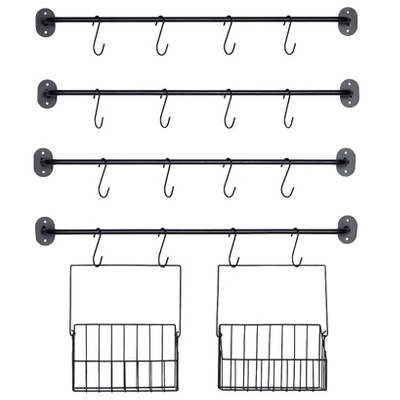 This wall-mounted mug rack set is designed to keep your kitchen organized and stylish. Each rack features a horizontal bar with evenly spaced hooks, perfect for holding mugs by their handles. Comes with 4 horizontal bars, 16 hooks, and 2 baskets. Bottom two racks include additional wire basket attachments for storing items like tea bags, coffee pods, or other small kitchen essentials. This set not only saves counter space but also keeps your mugs and related items within easy reach, enhancing both functionality and aesthetics in your kitchen.
