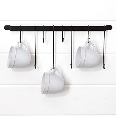 Free up cabinet space with the use of this wall-mounted coffee mug holder. The simple design of this mug organizer works with almost any style of kitchen decor–even yours. The coffee mug rack holds up to 8 mugs in a high/low arrangement of hooks to save space. Assembly is required for this coffee cup holder and the assembly hardware is included. Includes: Bar, 1″ dia. x 22″L. 4 Short hooks, 1/4″W x 1-1/2″D x 3-1/2″H, each. 4 Long hooks, 1/4″W x 1-1/2″D x 9″H, each. Metal.